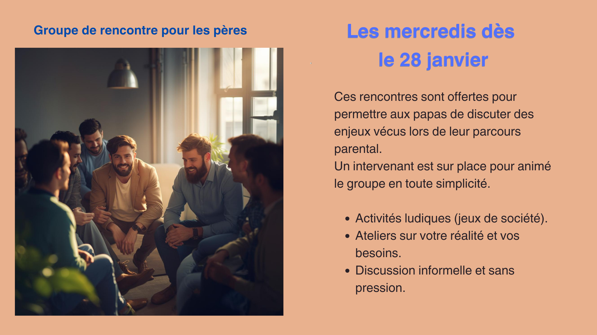 Ces rencontres sont offertes pour permettre aux papas de discuter des enjeux vécus lors de leur parcours parental.